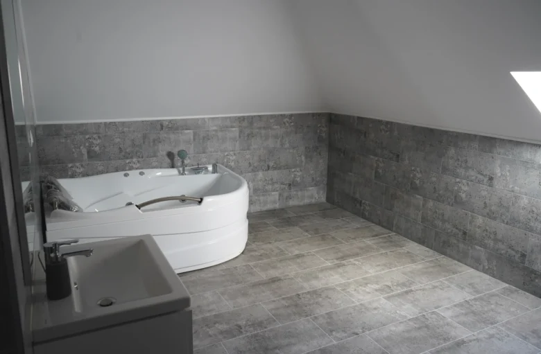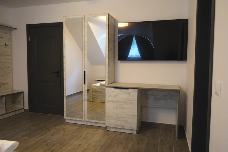 Descoperiți Camera Dublă Deluxe de 20 m², la mansardă, cu cadă spa hidromasaj și vedere la munți. Ideală pentru 2 oaspeți, include pat queen, WiFi gratuit, TV cu ecran plat și bucătărie comună. Dotată cu mașină de spălat vase, spălătorie comună și bideu, oferă relaxare premium. Rezervați acum pentru cazare Bucovina de lux!